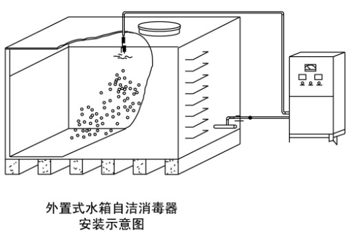 ZD-WTS-2A系列水箱自潔消毒器由電控柜和循環(huán)水缸兩部分組成,電控柜為潛水泵等電源部分的控制系統(tǒng),循環(huán)水缸中有潛水泵、吸水管、布水器、曝氣部分組成,兩者之間由管路及電纜連接。