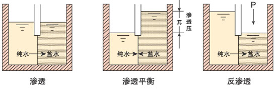 如圖所示:低濃度側(cè)水會(huì)透過(guò)半透膜向高濃度側(cè)擴(kuò)散,直至達(dá)到動(dòng)態(tài)平衡。此時(shí)半透膜兩側(cè)的液位差形成為滲透壓。當(dāng)在高濃度側(cè)加一外部壓力,隨壓力增加,水分子逐漸滲透到低濃度一側(cè)。當(dāng)所施加壓力大于滲透壓時(shí),低濃度側(cè)液位將高于高濃度側(cè)液位,這種現(xiàn)象稱(chēng)為反滲透。